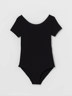 Купальник гимнастический с коротким рукавом. Вырез горловины и проймы ножек окантованы бейкой из основного полотна.