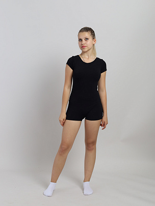 Купальник гимнастический с коротким рукавом. Вырез горловины и проймы ножек окантованы бейкой из основного полотна.