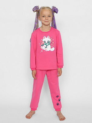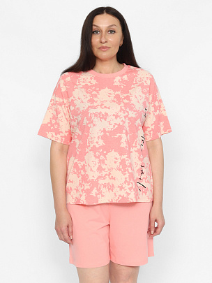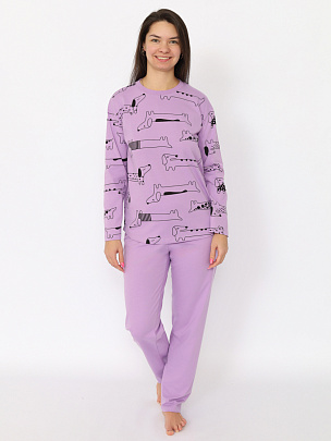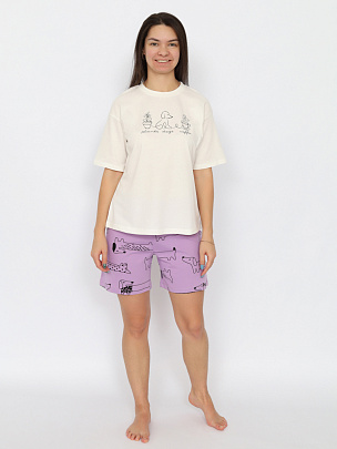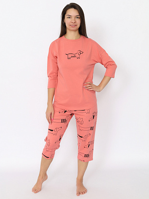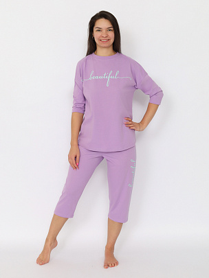Гладкокрашенная пижама из джемпера и бридж. Джемпер свободного покроя с рукавом 3/4. Горловина обработана притачной бейкой из рибаны с лайкрой. Перед оформлен принтом. Бриджи прямые умеренного объёма длиной ниже колена выполнены из полотна дополнительного цвета. Цельнокроенный пояс обработан плоским швом вподгибку с одновременным прокладыванием резинки. На левой стороне - принт.