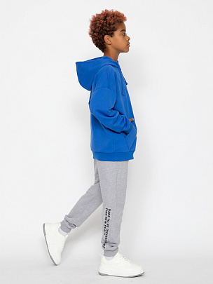 Брюки для мальчика со смещенными боковыми швами и карманами в боковых швах. По низу брюк эластичные манжеты. Пояс притачной с резинкой и функциональным шнуром. Сзади брюки декорированы принтом "Будь не таким как все и покоришь новые вершины".