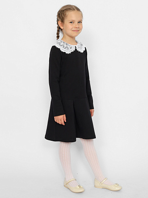 Платье для девочки из футера. Изделие с длинными рукавами, отложным съемным воротником из кружева. Отрезное чуть ниже линии талии. Сзади застегивается на пуговку. Декорировано бантиком.