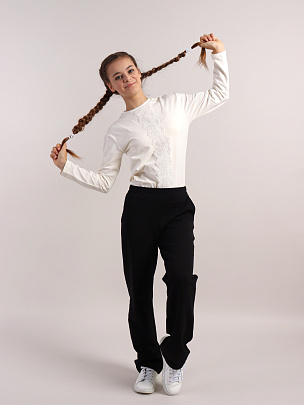 Джемпер свободного силуэта для девочки со спущенным плечом и длинными рукавами. Полочка декорированя кружевом. Воротник из основного полотна.