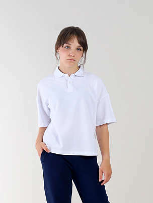 Джемпер-поло из пике для девочки, с короткими рукавами, свободного силуэта, спущенным плечом и отложным воротником. Спереди застежка на пуговицы. Декорирован вышивкой.