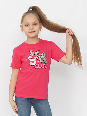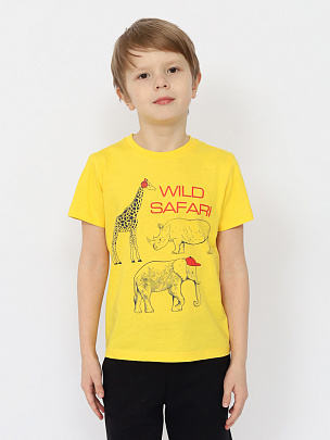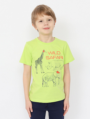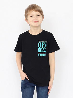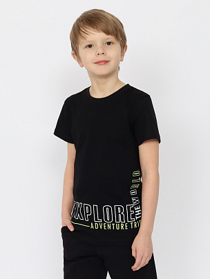 Футболка с коротким рукавом. Горловина круглая, обработана узким воротником из полотна с эластаном. Перед оформлен небольшим принтом.