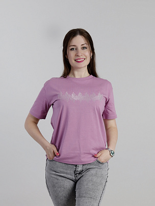 Футболка прямого силуэта с короткими рукавами. Горловина круглая, обработана притачной бейкой из рибаны с лайкрой. Перед футболки декорирован блестящим принтом, имитирующим пайетки.